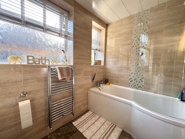 Suite comprising: Bath with a shower over and curved shower screen, wash hand basin and low level WC set into a vanity unit. Chrome ladder style radiator. Two UPVC decorative/double glazed windows.