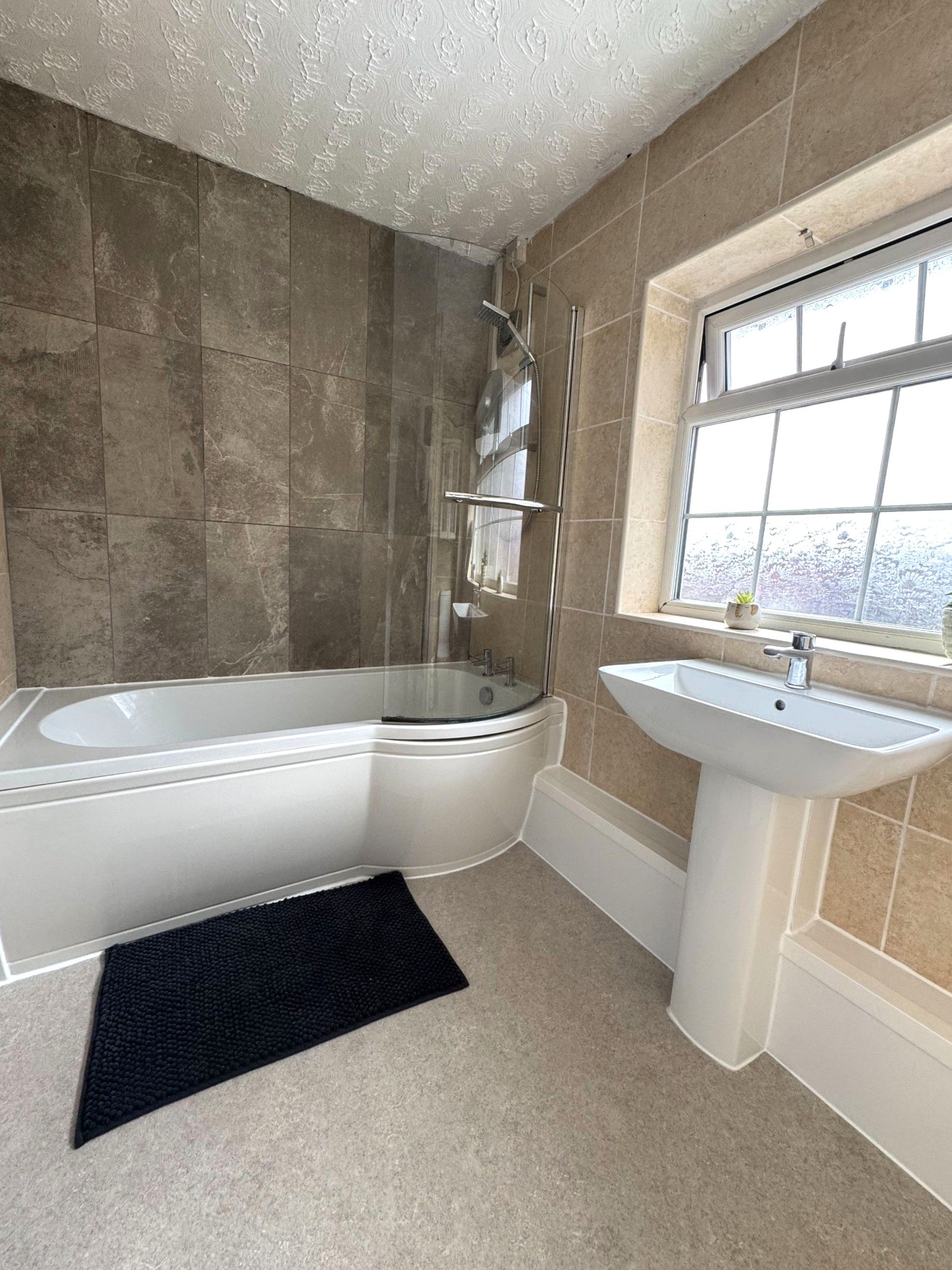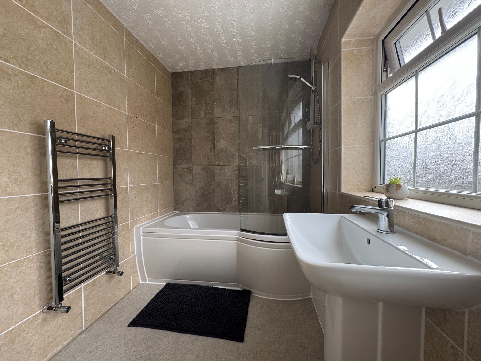 Suite comprising: P shaped bath electric shower over and curved screen, wash hand basin and low-level WC. UPVC decorative glazed front windows. Chrome towel rail style radiator.