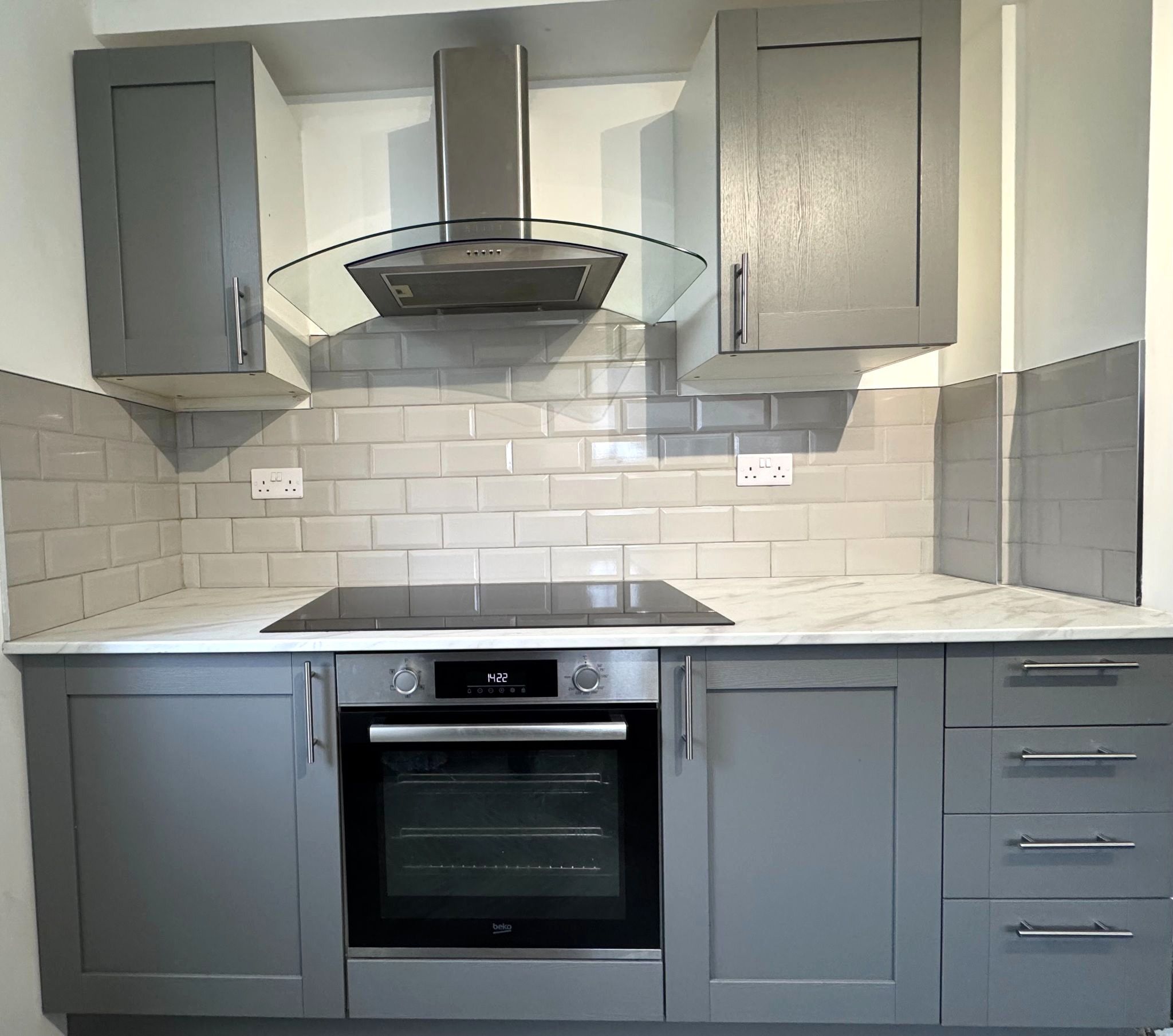 Re-fitted with base and eye level units. The base units are topped with complementary work surfaces. Tiled to cooking, washing and preparation areas. Stainless steel sink with mixer taps which is set beneath a UPVC double glazed side aspect window. Cooking appliances comprise: Oven, five ring halogen gas hob with modern canopy style extractor hood over. Ample space for various white goods. Storage cupboard which houses the utilities. A part glazed UPVC door give access to the rear elevation. A Worcester combination boiler is concealed with one of the eye level units.