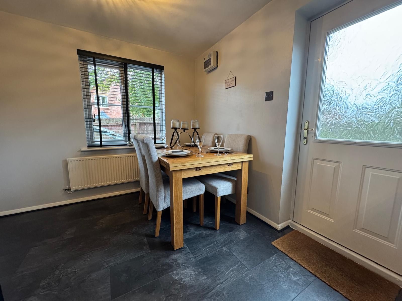 Fitted with matching base and eye level units. The base units are topped with complementary work surfaces. Splash back to the cooking area, washing and preparation areas. Integrated cooking appliances comprise: oven, hob with an extractor hood over. Space for white goods even an American fridge/freeze. One and a quarter bowl sink with mixer taps which is set beneath a UPVC double glazed window. Radiator. Wall mounted Worcester boiler. A part glazed door give access to the rear garden. Space to accommodate a table and chair.