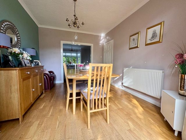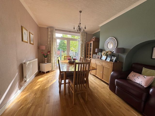 UPVC double glazed double opening French doors give access to the delightful rear garden. Radiator. Ample space to accommodate a dining table and chairs.