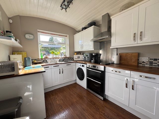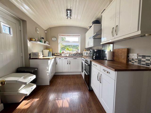 A well fitted/modern kitchen with a range of base and eye level units which are topped with natural wood block work surfaces. Integrated cooking appliance oven and grill, separate halogen hob with an extractor hood over. Space to accommodate an upright fridge/freezer. Tiled to the cooking and washing areas. One and a quarter bowl sink with mixer taps which is set beneath a UPVC double glazed side aspect window. Radiator.