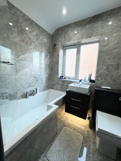 Suite comprising: P shaped bath with a direct feed shower over, wash hand basin with a vanity unit set beneath and low level WC. UPVC decorative glazed window. Chrome ladders style radiator. Ceiling inset down lighting. Chrome ladder style radiator.