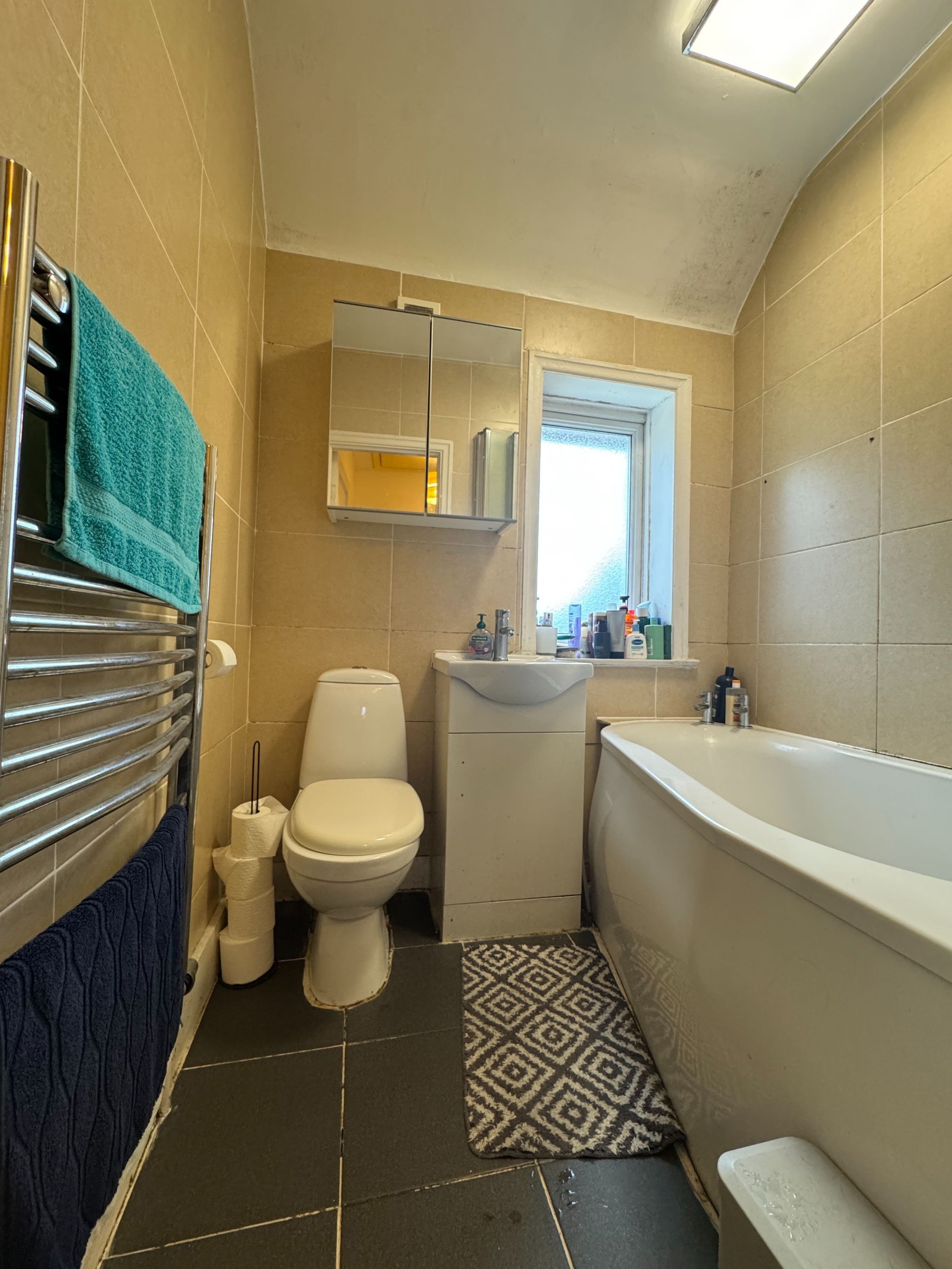 Bathroom: Three piece suite comprising: bath with electric shower unit over, wash hand basin and low level WC. Chrome ladder style radiator. Tiled walls and floor. Extractor fan.