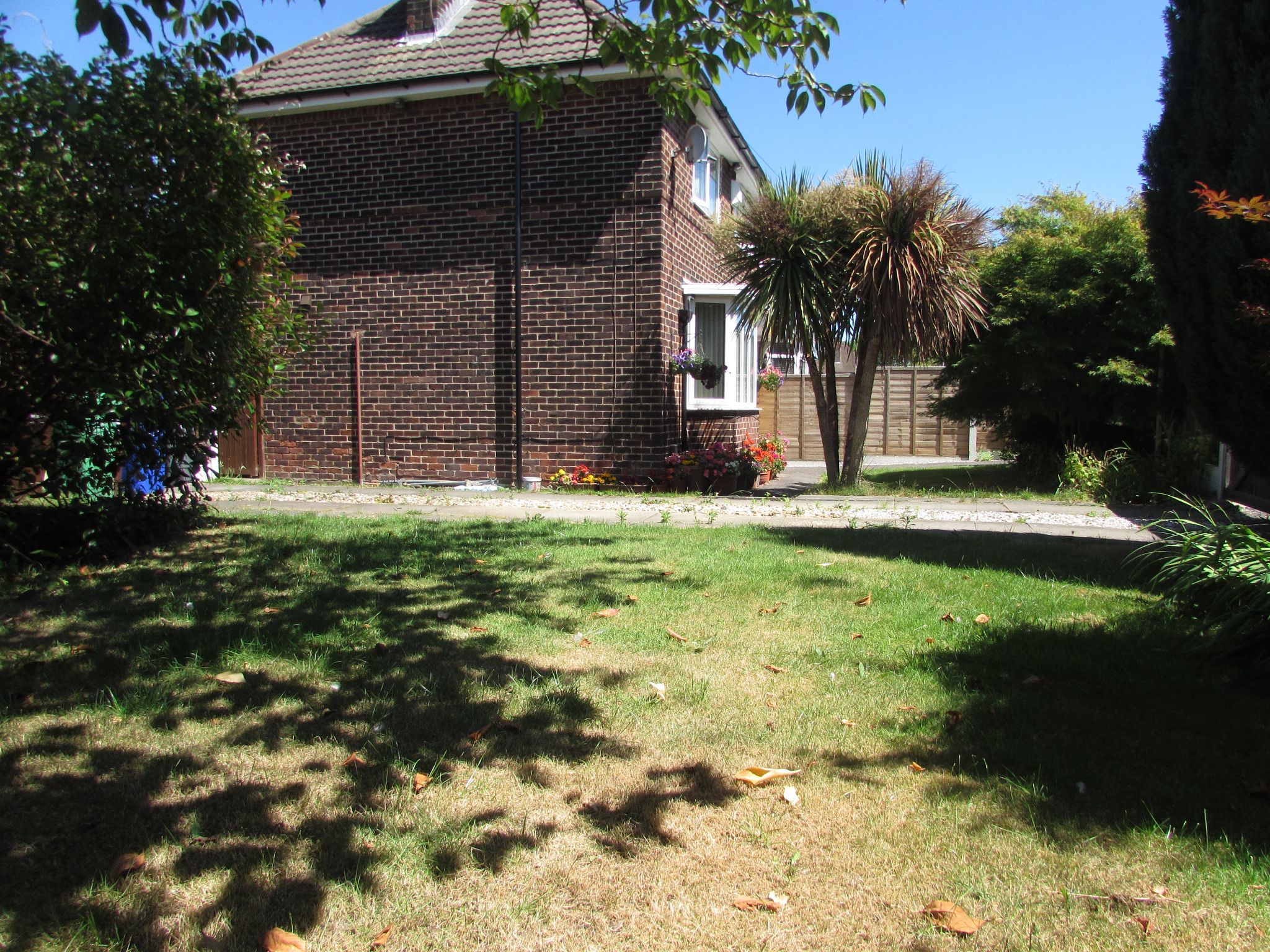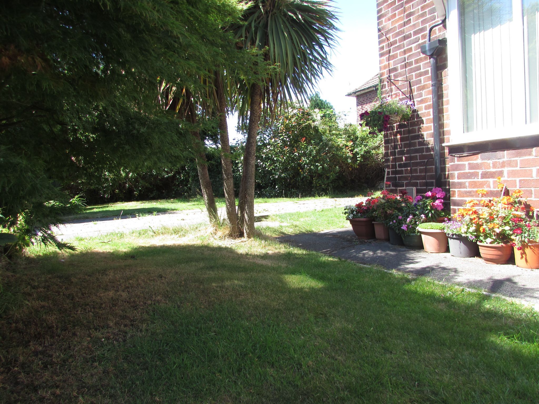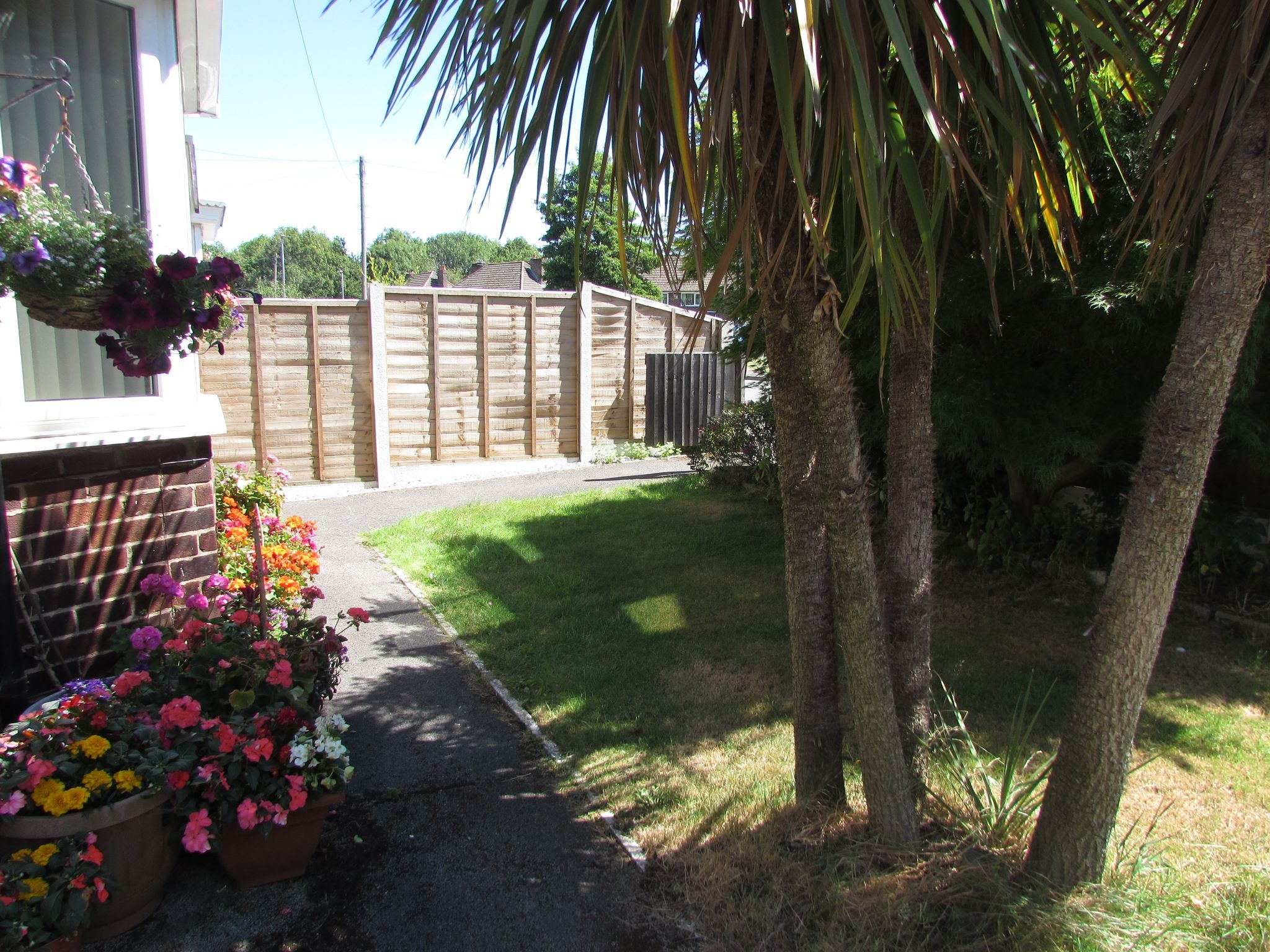 Outside The property occupies a large corner plot. The front has a driveway for several vehicles. And has lawned area planted out with flower shrubs, palm trees and bushes. The rear has an area behind the conservatory which us idea for the drying of linen. There is a patio leading from the conservatory.