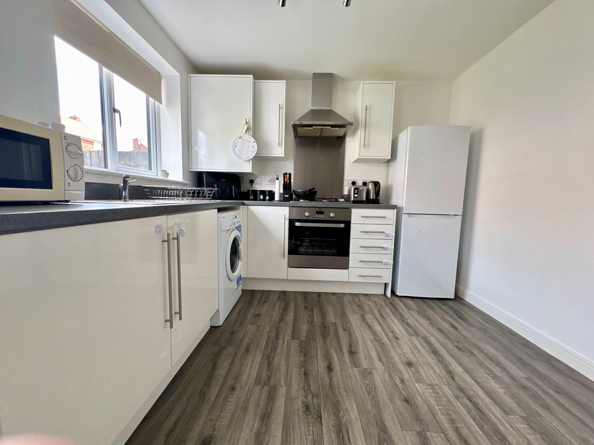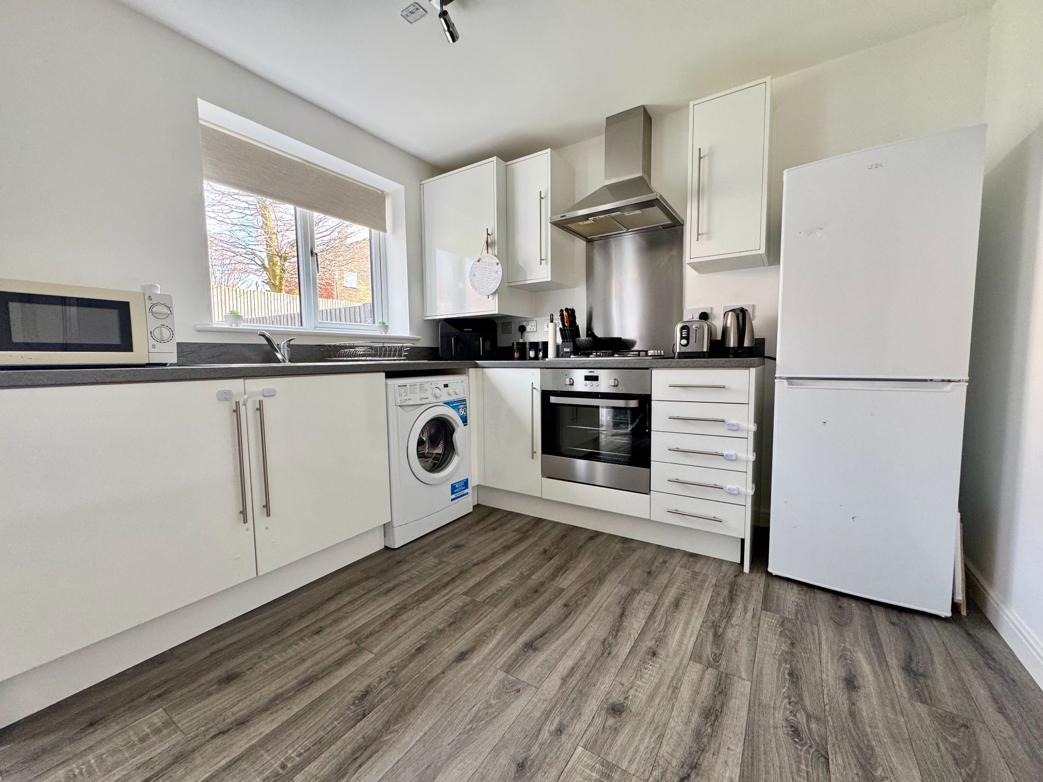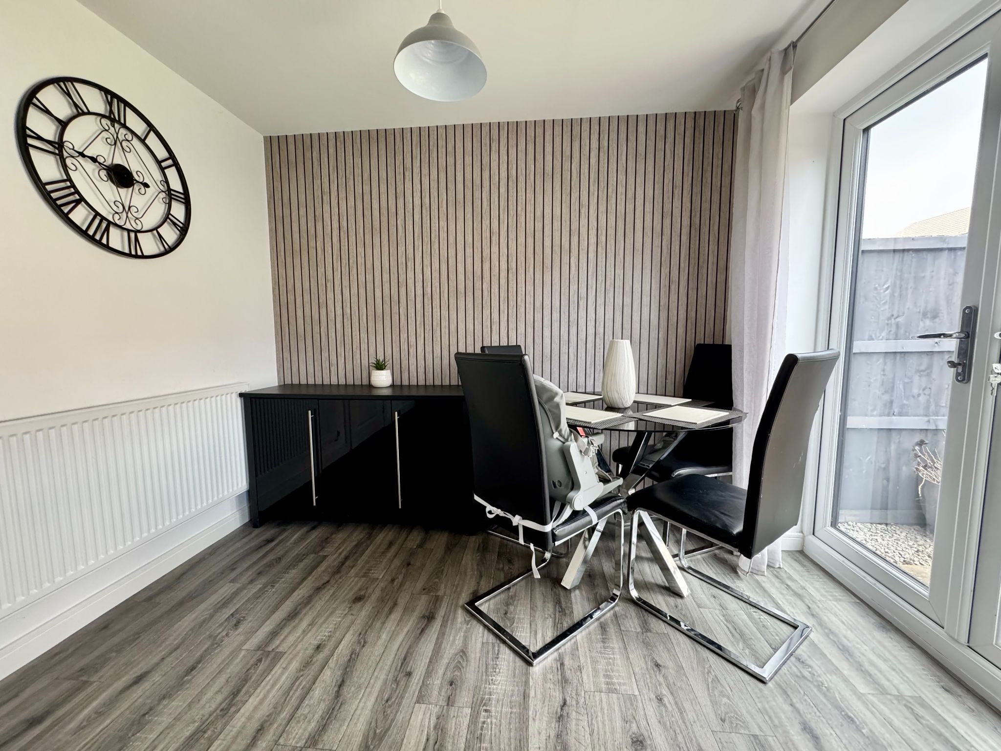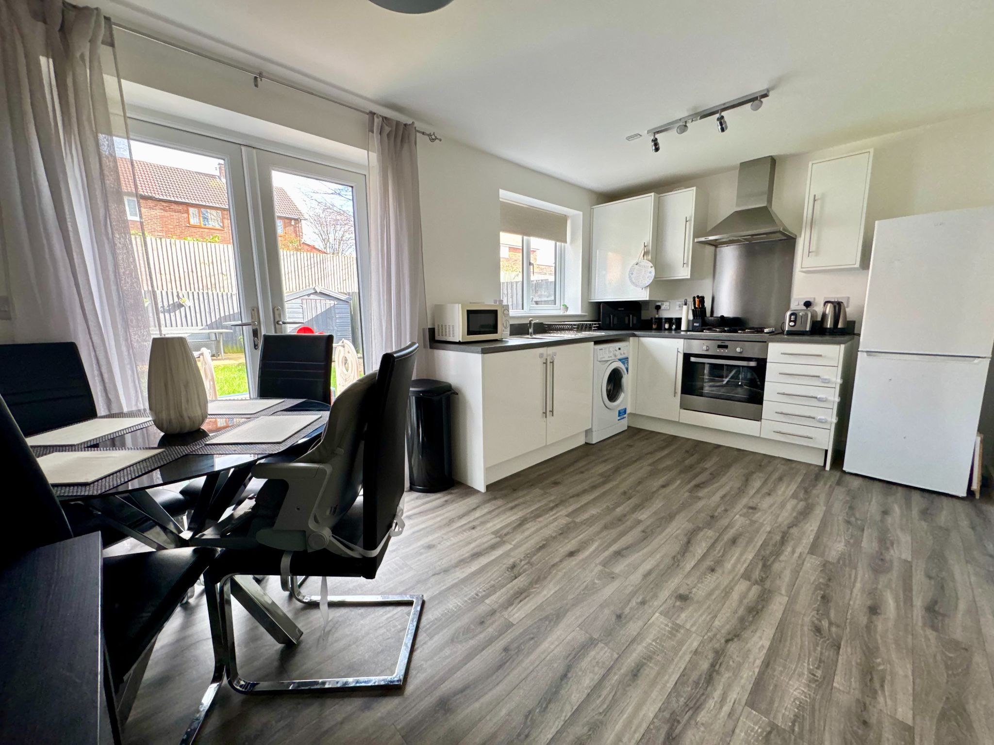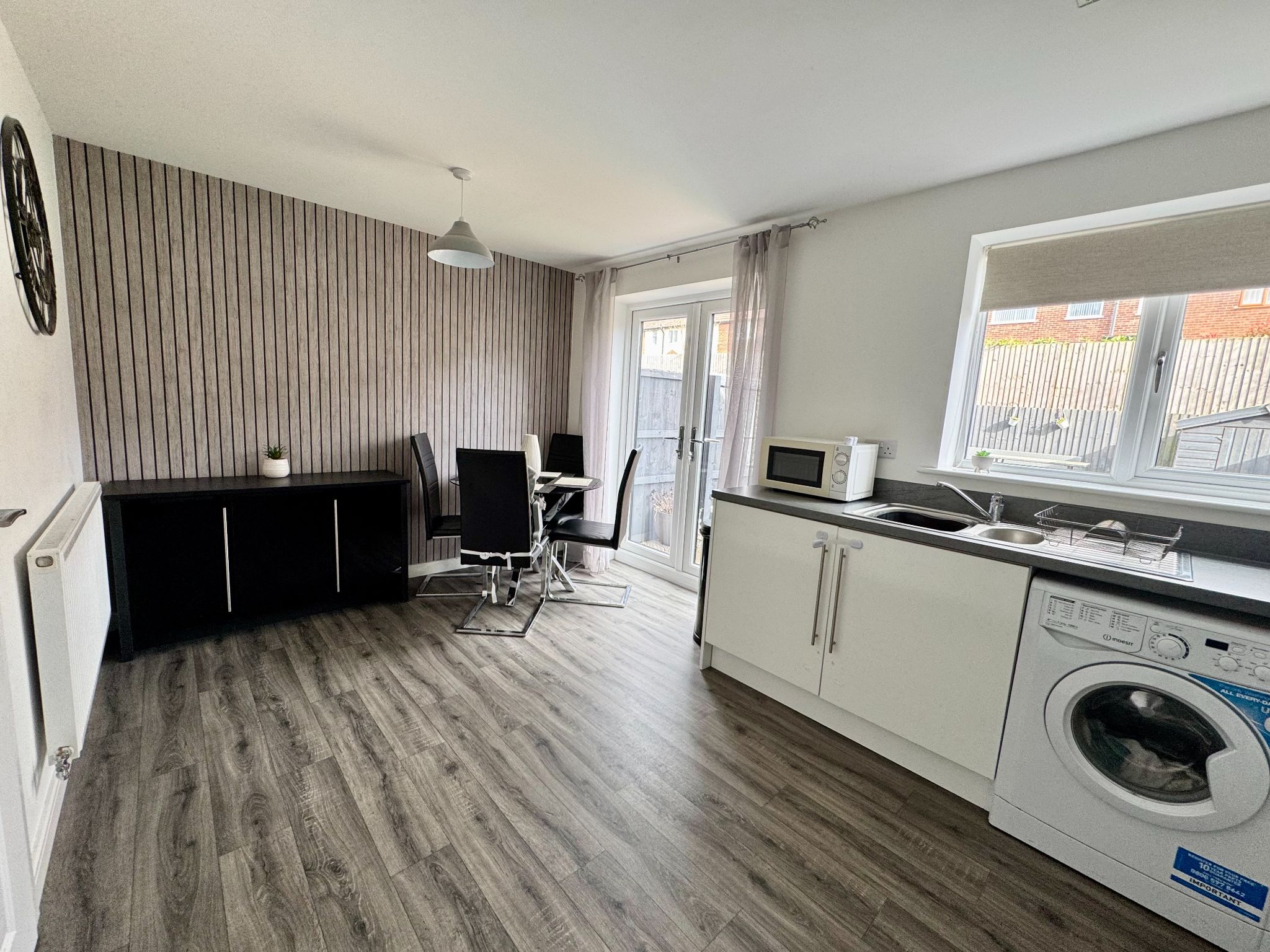 Fitted with modern base and eye level units with complimentary worktops. Integrated cooking appliances comprises of oven, gas hob with splash back, canopy style extractor hood over. Stainless steel sink unit with mixer taps which is set beneath a UPVC double glazed rear aspect window. The boiler is concealed within one of the eye level units. Ample space to accommodate a table and chairs. Double opening patio doors gives access to enclosed rear garden.