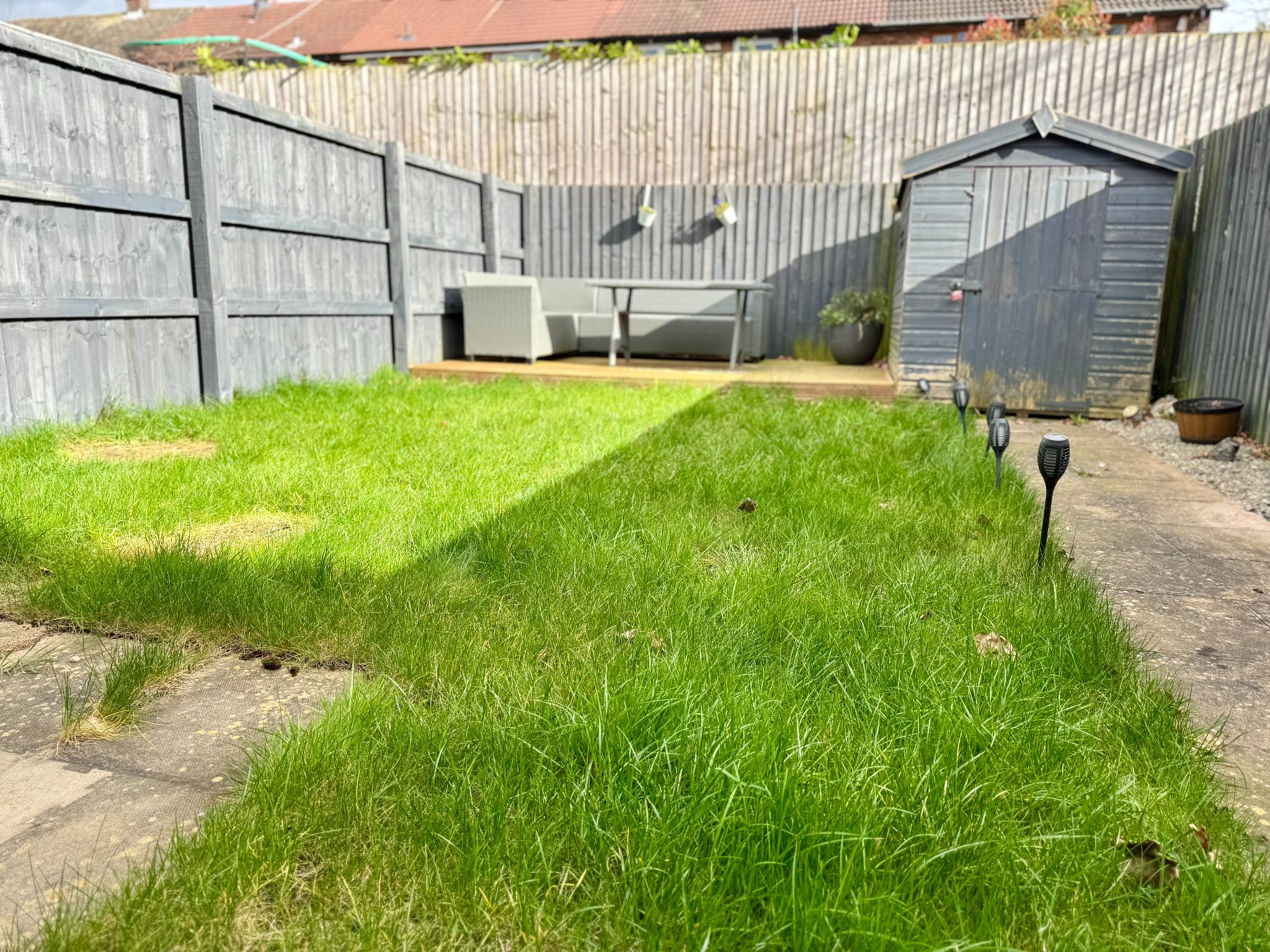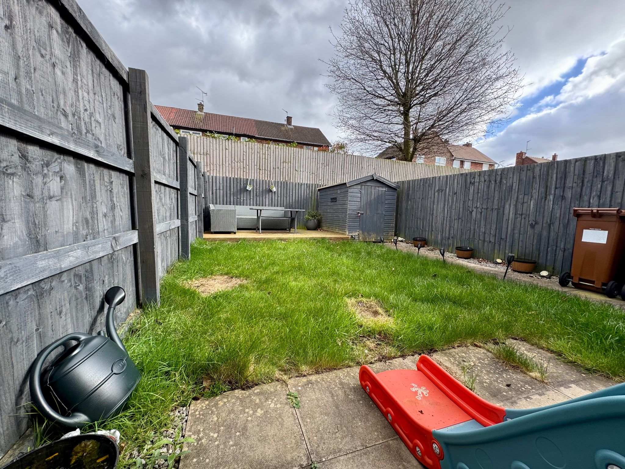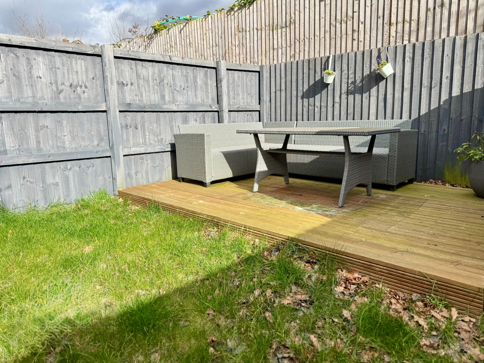 The enclosed rear garden has a decked-out area which is ideal for dining purposes and enjoys a good degree of sun, ideal in the summer months for alfresco dining and entertaining. Lawned area ideal for children to play.