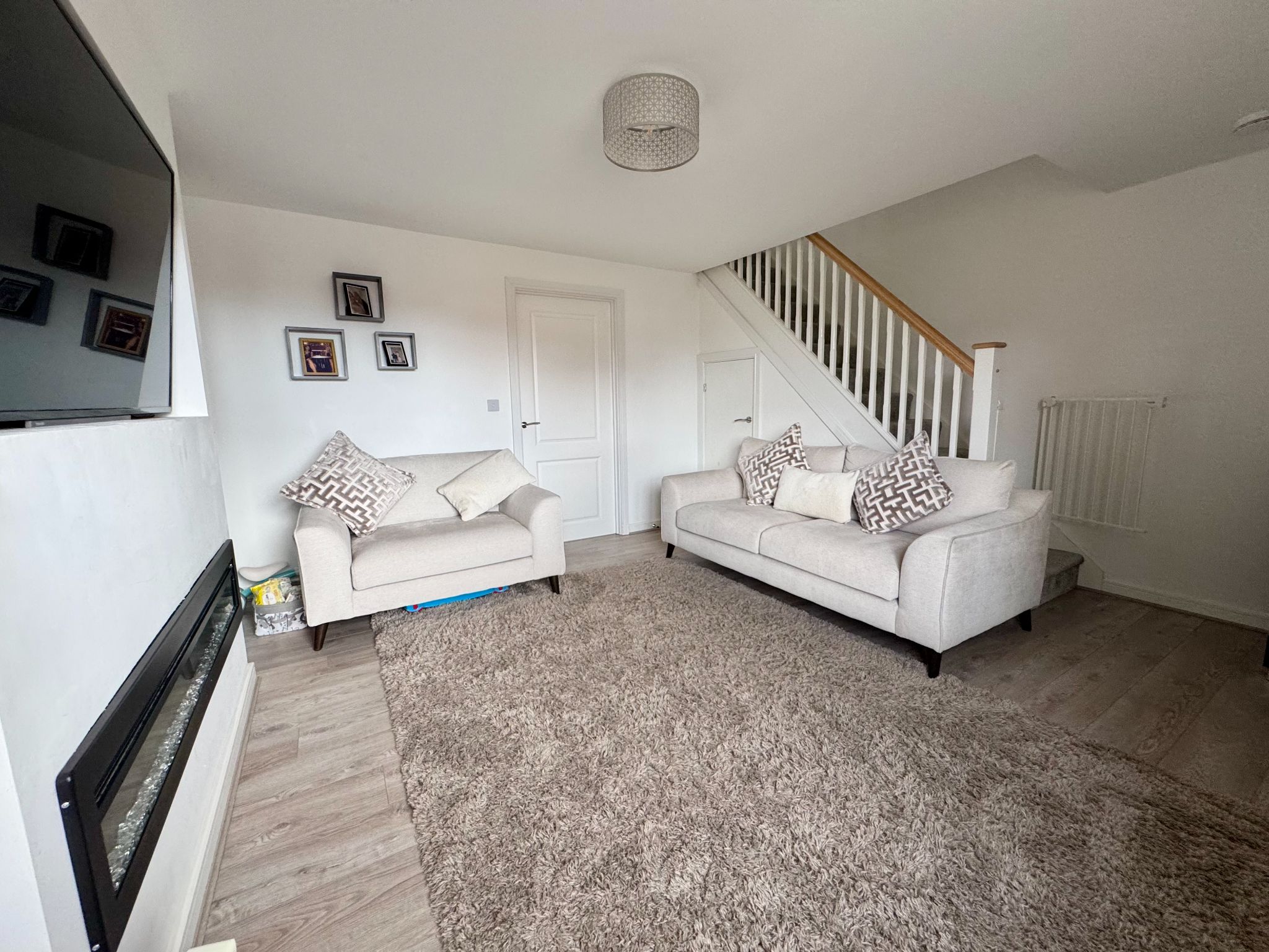 A delightful room in which to relax with a fire feature. UPVC double glazed front aspect window. A staircase for access to the first floor. Radiator. A door gives access to: